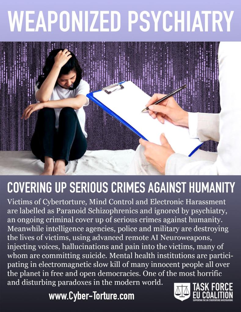 Le plus grave est la potentielle psychiatrisation et les arrestations arbitraires des victimes ayant craquĂ© sous l’effet des armes psychotroniques ou des intimidations, ils peuvent devenir paranoĂŻaques et ĂȘtre internĂ© de force avec un faux diagnostique de « schizophrĂ©nie », invalidant la victime parfois Ă vie. Les services de renseignement, de police et les hĂŽpitaux sont parfaitement synchronisĂ©s lorsqu’il faut persĂ©cuter un individu ciblĂ© qui quitte la matrice.