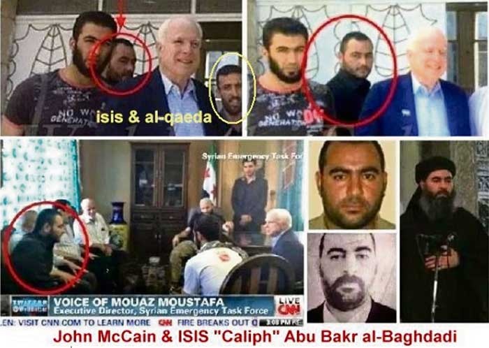 La connivence AmĂ©ricaine y est Ă©galement pointĂ©e avec des photographies du calife avec l’infĂąme sĂ©nateur John McCain.