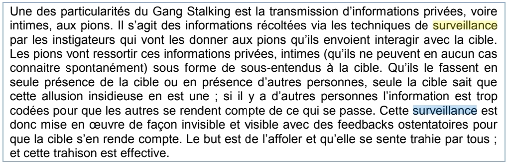 Tout a commencé en septembre 2015 mais potentiellement avant également sans avoir pu y prêter attention. Elle affirme avoir été et est toujours victime d’harcèlements en voitures, plusieurs voitures tournaient autour de chez elle et la suivaient. Elle affirme également avoir été violée pendant 6 mois durant son sommeil et dispose de preuves d’intrusions à son domicile et souffrait de douleurs rectales et abdominales, ce type de crimes est fortement usité par le deep state dans le cadre du projet Monarch, suite logique du programme MK Ultra. Elle l’apprit par des dames engagées par l’état profond qui discutaient à voix haute qui lui ont fait comprendre, cette technique de déstabilisation mentale a ete documentée par Jocelyne Abadie, consultante Française en éthique dans son document « Du harcèlement en réseau au harcèlement global«